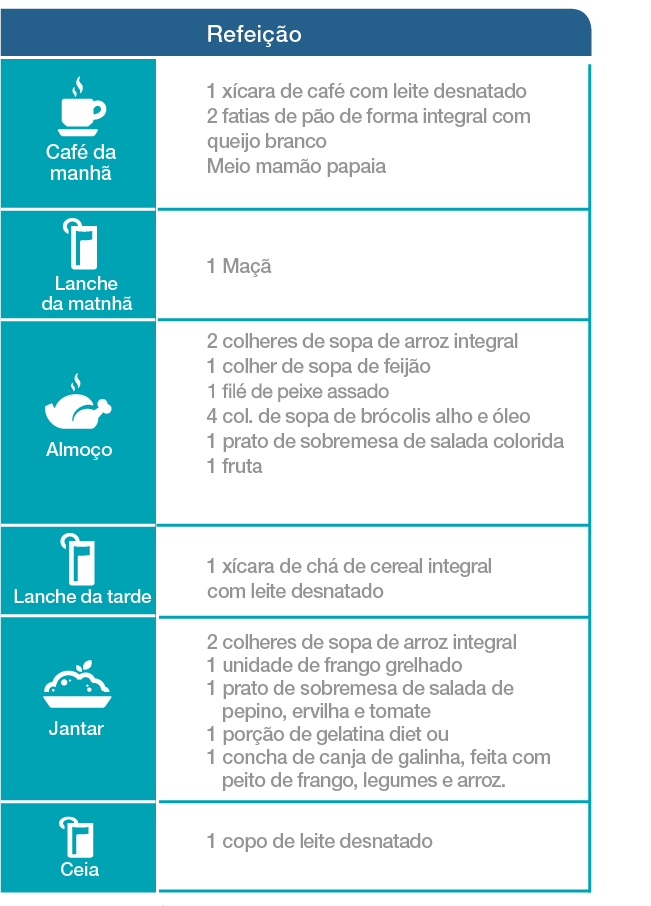 Siga o exemplo do cardápio abaixo, que contém cerca de 1.300 calorias. Se tiver algum problema de saúde, sua alimentação deve ser adaptada. Para isso, procure um nutricionista.