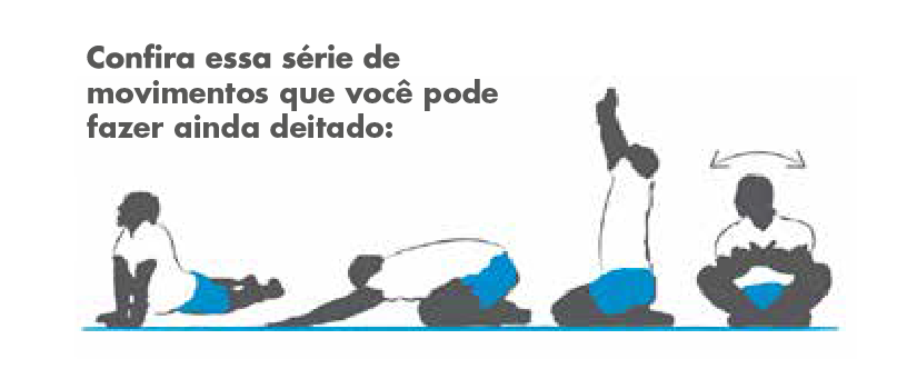 Ao acordar, aproveite para fazer dez minutos de alongamento leve, sem precisar sair da cama, e tenha um dia mais relaxado e saudável. Começar o dia fazendo exercícios proporciona prazer de imediato, maior disposição e bom humor para o trabalho.