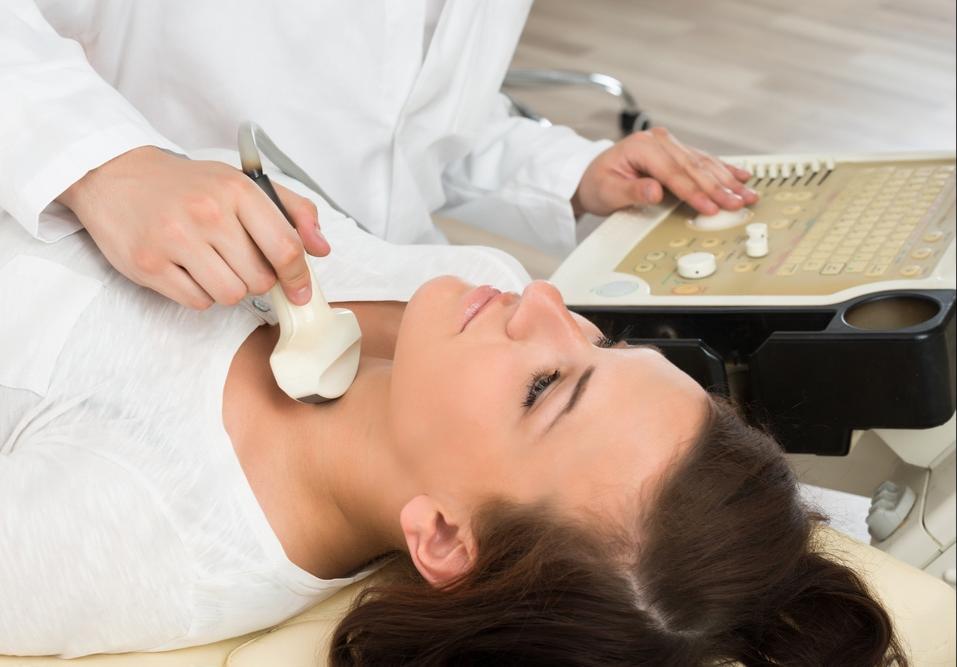 Um médico usa um ultrassom para examinar a tireoide de uma mulher; exame permite identificar alterações em fase inicial — Adobe/Reprodução