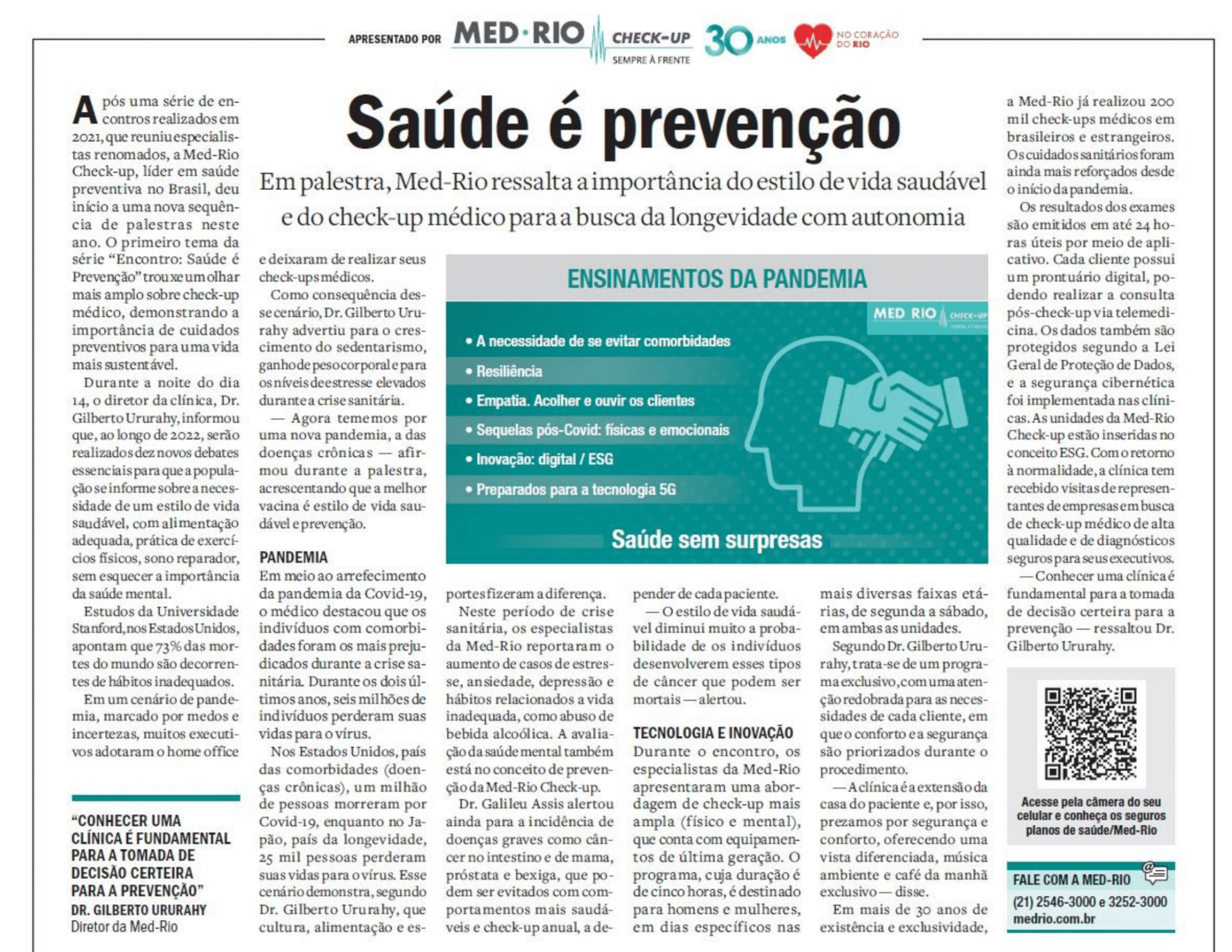 Após uma série de encontros realizados em 2021, que reuniu especialistas renomados, a Med-Rio Check-up, líder em saúde preventiva no Brasil, deu início a uma nova sequência de palestras neste ano. O primeiro tema da série “Encontro: Saúde é Prevenção” trouxe um olhar mais amplo sobre check-up médico, demonstrando a importância de cuidados preventivos para uma vida mais sustentável.